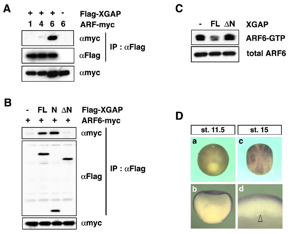 (A) XGAP binds specifically to ARF6. HEK293T cells were co-transfected with XGAP-Flag