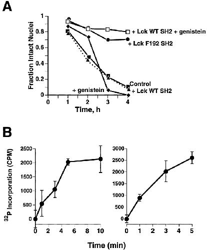 Figure 3. The wild-type Lck SH2 domain is inactive in the extract because it becomes phosphorylated. (A) Genistein, an inhibitor of tyrosine kinases, restored the ability of the wild-type Lck SH2 domain to inhibit apoptosis. The experiment was done as in Fig. 2, except that genistein (10 μM) was added to the indicated samples either separately or along with the wild-type (WT) Lck SH2 domain–GST fusion (100 nM). (B) A kinase in the Xenopus egg extract can phosphorylate a synthetic peptide corresponding to the site surrounding Y192 in Lck. The peptide (RNLDNGGFYIAPR) was incubated in a buffer containing γ-[32P]ATP and Xenopus egg extract (diluted as described in Materials and Methods) for the times indicated, and the incorporated radioactivity was assayed (see Materials and Methods). Two separate experiments are shown.