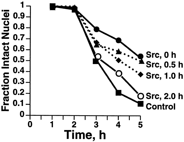 Figure 5. The Src SH2 domain inhibits an activity important in the early portion of the apoptotic process. The experiment was performed as above, except that the GST–Src SH2 fusion was added (final concentration 100 nM) at the indicated times after the start of incubation.