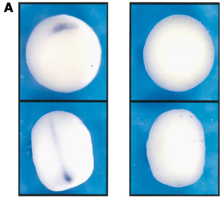 FIG. 2. (A) Whole-mount in situ hybridizations of gastrula and neurula stage embryos with antisense probe recognizing Xnr4 (panels on