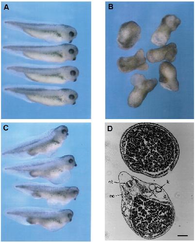 Embryos, injected ventrally with 0.4 ng of a control ÆXdsh mRNA (C), are indistinguishable from normal tadpoles or from the tadpoles,