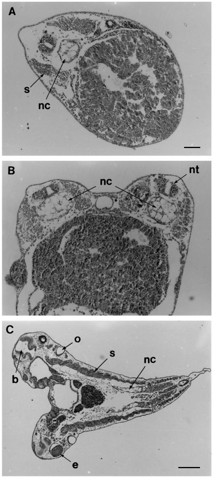 as follows: nt, neural tube; nc, notochord; s, somite; e, eye; o, otic