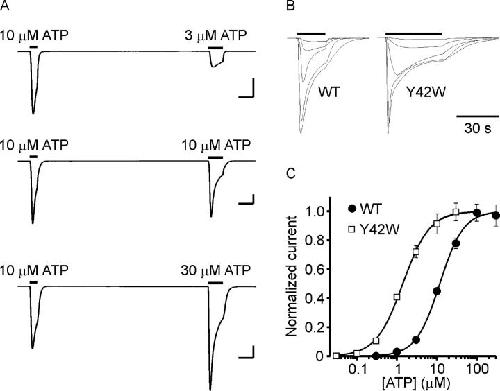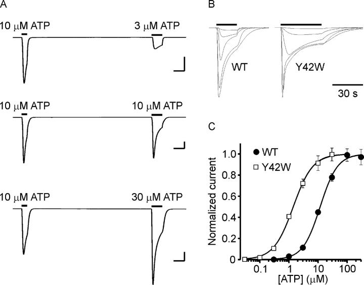 Figure 2. . Generation of concentration–response relationships. (A) Representative current traces in response to ATP recorded from oocytes expressing WT P2X4 receptor channels. Each trace is from a different oocyte. A reference concentration of ATP (3 μM) was applied first followed 2 min later by a test concentration (indicated by solid bars above the current traces). Calibration bars: 10 s and 0.2 μA. (B) Superimposed normalized current traces of WT (left) and Y42W (right) receptor channels. The bars above the current traces indicate the duration of ATP application. The concentrations of ATP are 1.0, 3.0, 10, 30, and 100 μM for WT and 0.1, 0.3, 1.0, 3.0, and 10 μM for Y42W. (C) Normalized concentration–response relationships for the WT receptor channel (full circles) and for Y42W (empty squares). Each point is the average ± SEM of 4–5 measurements. The EC50 and (n) estimated from fitting the Hill equation to the WT and Y42W data are 11.8 ± 0.7 μM, (1.5 ± 0.1), and 1.4 ± 0.1 μM, (1.3 ± 0.1), respectively.