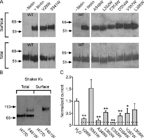 Figure 7. . All of the nonfunctional mutants form nonconducting channels. (A) Western blots from SDS-PAGE of P2X4 receptor channels obtained from surface membrane preparation (top) and total crude membrane preparation (bottom). Each lane contains the protein from an equivalent of 20 oocytes (surface) or 1 oocyte (total). All the oocytes expressing mutant channels were treated with biotin. The four left lanes and the eight right lanes are from two separate experiments. Numbers to the left are molecular weight markers in kD. (B) Western blots from SDS-PAGE of c-myc–tagged Shaker I477D and F481W protein obtained from surface membrane preparation (right two lanes) and total crude membrane preparation (left two lanes). Each lane contains the protein from an equivalent of 20 oocytes (surface) or 1 oocyte (total). F481W protein has two dominant forms, a core-glycosylated form (∼70 kD) and a mature form (∼100 kD). I477D exhibits only the core-glycosylated form. Numbers to the left are molecular weight markers in kD. (C) Mean ± SEM currents (averaged from 10 oocytes) from oocytes coinjected with 1:1 mixtures of cRNA for the WT and nonconducting mutant channel subunits. Oocytes injected with a 1:1 dilution of WT cRNA served as a control. The dashed line represents the expected current if the subunits randomly assemble to form trimers and a single mutant subunit prevents channel function. Significant differences between the control and each of the other groups was assessed with ungrouped Student's t test. *, P < 0.05; **, P < 0.001.