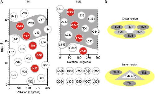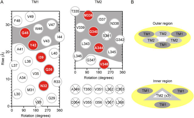 Figure 8. . Proposed secondary structure and packing of the TMs of P2X4 receptor channels. (A) TM1 and the outer region of TM2 are depicted as α-helical structures. The residues that exhibit the greatest perturbations in EC50 relative to the neighboring residues are in red. The regions of large perturbation in EC50 are shaded gray. Mutations that result in nonconducting channels are crossed out. (B) A schematic representation of the proposed packing of the TMs in the outer and inner regions of the membrane. Toward the inside, TM1 is depicted as being more peripheral, interacting with TM2 through the residues labeled in A in red. The inner triangle denotes that the secondary structural for the inner region of TM2 is undefined. Toward the outside, both TM1 and TM2 are depicted as α-helices, and are likely more tightly packed.