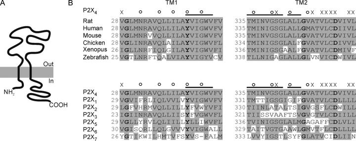 Figure 1. . Putative transmembrane regions of P2X receptor channels. (A) Schematic representation of the general topology of a P2X receptor channel subunit. (B) Sequence alignment of TM1 (left) and TM2 (right) of P2X4 receptor channels from different species (top) and of rat P2X1–P2X7 (bottom). Bold residues are identical across all known P2X receptor channels (except for a Y to F substitution in Xenopus P2X7). The major findings of this study are summarized above the sequences. X indicates mutations to tryptophan that result in nonconducting channels. Empty circles and bars indicate positions and regions of large perturbations in EC50 induced by the mutations, respectively.