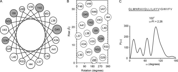 Figure 4. . TM1 is likely an α-helix. Helical wheel representation (A) and helical net diagram (B) of TM1. The residues in the helical wheel representation progressively decrease in size from the outer to inner ends of TM1 (residues W46–V49 are not shown). The residues labeled in bold typeface in Fig. 3 map to one face of a presumed α-helix. (C) Fourier analysis of the fold change in EC50 for the region of TM1 underlined above. The primary peak of the power spectrum occurs at 102°. The α-PI calculated from the spectrum is 2.26. The EC50 for L40W was taken to be 30 μM (see Table I).