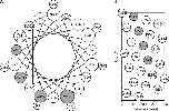 Figure 6. . The extracellular region of TM2 seems to be an α-helix. Helical wheel representation (A) and helical net diagram (B) of TM2. The residues in the helical wheel representation progressively decrease in size from the outer to inner ends of TM2. The residues labeled in bold typeface in Fig. 5 map to one face of a presumed α-helix.