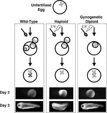 (center column). In the third, after fertilization by UV-irradiated sperm, the