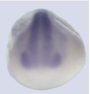 foxm1 (forkhead box M1 ) gene expression in Xenopus laevis embryo, assayed via in situ hybridization, NF stage 19, anterior view, dorsal up.