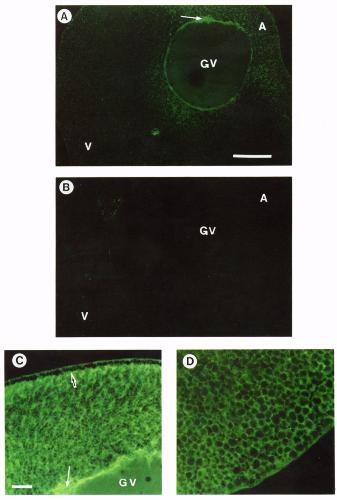 stages Ill-IV (open arrows) and is weak in fully grown oocytes of stages V-VI (data not shown), possibly owing to a large increase in the volume