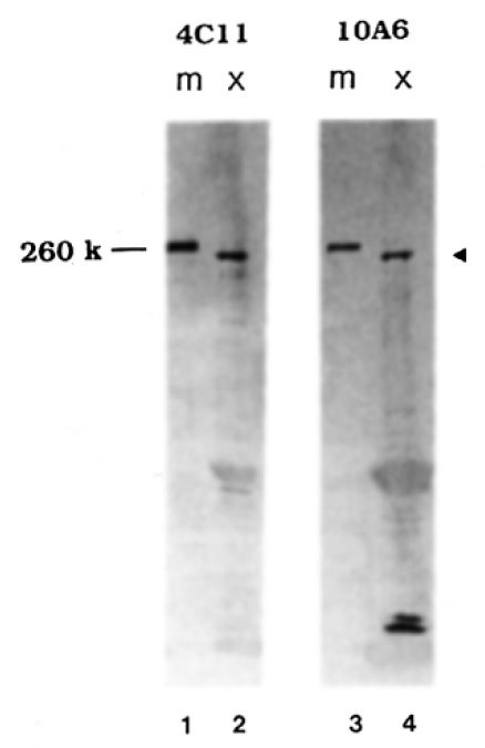 is detected with lOA6. The apparent molecular size (260 kd) of the