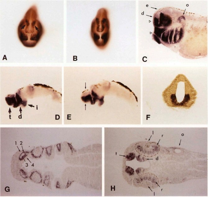 Fig. 4. (A) Whole-mount in situ hybridization to a stage 32 embryo (anterior view) showing the most intense area of XDLL-1 expression in the forebrain - the lateral diencephalic region (arrow) (B) In situ hybridization of XDLL-1 to a stage 33/34 embryo (anterior view), At this stage the entire ventralforebrain is uniformly labeled. (C) A lateral view of the embryo in (B) showing the boundaries of XDLL-1 hybridization within the brain. Upper arrow (e) points at the epiphysis which delineates the dorsal limit of the telencephalon. The lower arrow (d) points at the dorsal limit of XDLL-1 expression boundary in the telencephalon which is ventral to the epiphysis. O, otic vesicle, upper triangle points to the plane of section in (H), lower triangle points to the plane of section in (G). (D) In situ hybridization of XDLL-1 to stage 42 brain. Lateral view. Forebrain is to the left. t, telencephalon; d, diencephalon; i, infundibulum. Apparent signal in the hindbrain area is due to pigment granules and not to hybridization. (E) Wholemount hybridization to stage 43 brain. Arrows indicate the plane of section in (F). (F) Cross section of the telencephalic region of the brain in (E) Notice the sharp boundaries of labeling. (G) Coronal section of the embryo in (c) at the level of pharyngeal arches (lower triangle in (C)). 1, ectoderm; 2, neural crest; 3, mesoderm; 4, endoderm. (H) Coronal section of the embryo in (C) at the level of the eyes (upper triangle in (C)). d, diencephalon; 1, lens; o, otic vesicle; r, retina; t, telencephalon. Notice the presence of hybridization in the retina and the absence of it in the lens.
