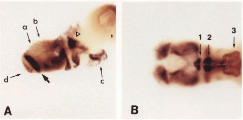 Fig. 5. (A) sagital section of a stage 45 brain. Arrow, area olfactoria primitiva; triangle, ventromedial thalamus; a, b, c, d indicate the planes of sections in Fig. 6A, B, C and D respectively. (B) A ventral view of the brain in (A) visualizing an increased level of expression of XDLL-1 in the neuroepithelium of medial preoptic nucleus (1), arcuate nucleus (2) and hypothalamus, pars ventralis (3).