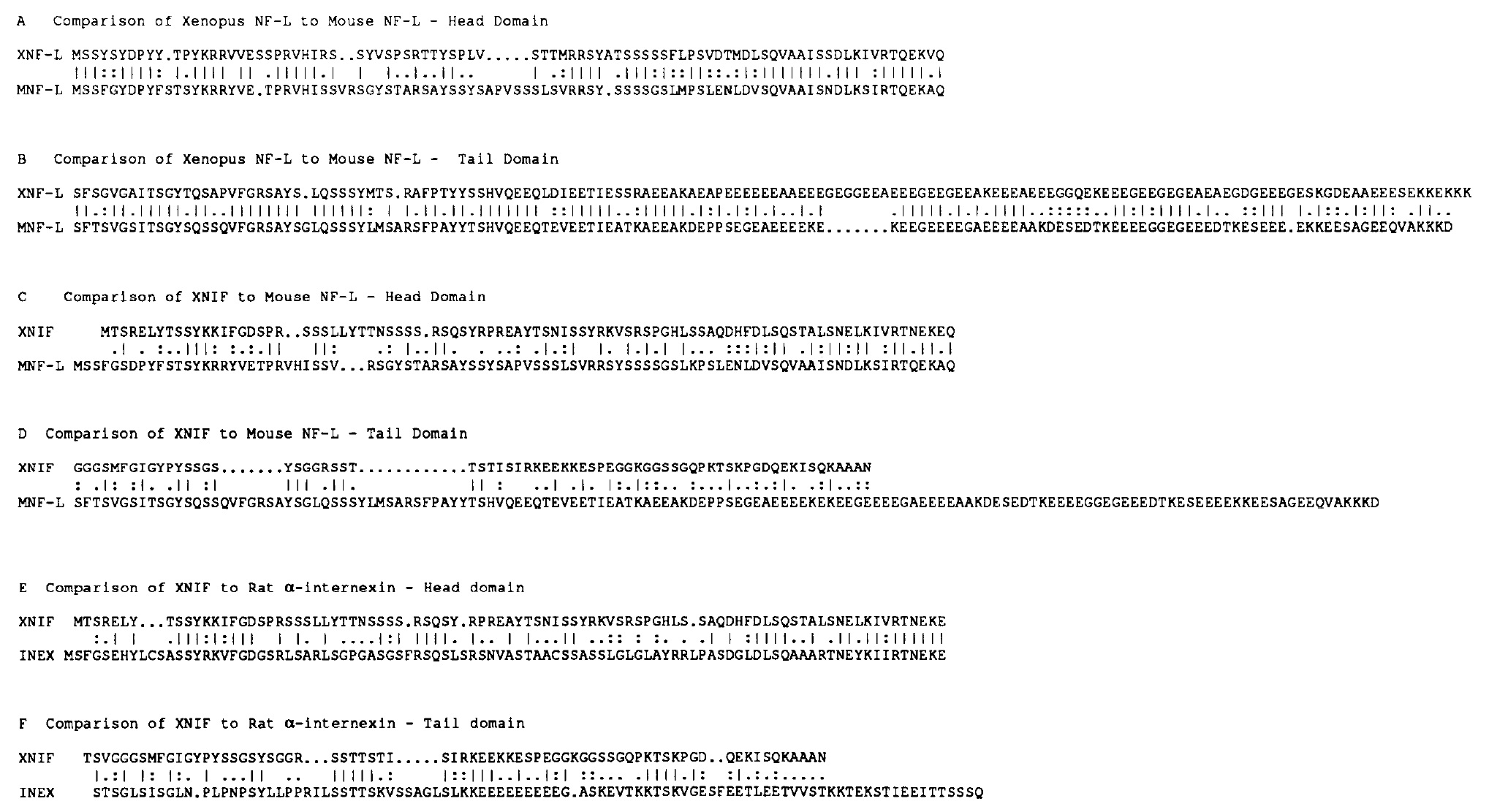 and rat a-intemexin (E. head, F, tail). Sequences were aligned using the GAP program of the Wisconsin Genetics Computer Group with a gap weight of 3.0 and a length weight of