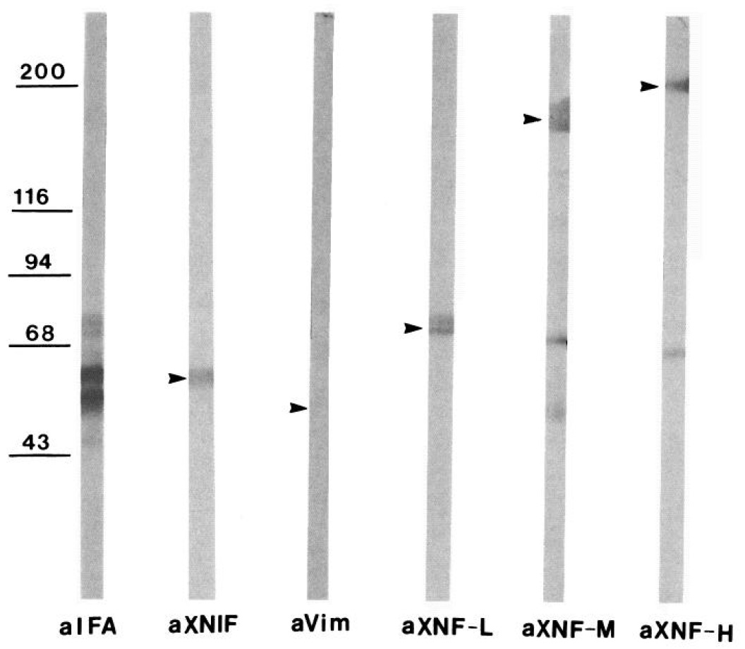 Xenopus laevis is a valuable model system for the study of vertebrate neuroembryogenesis. However, very few well-characterized nervous system-specific molecular markers are available for studies in this organism. We screened a X. laevis adult brain cDNA library using a cDNA probe for mouse low molecular weight neurofilament protein (NF-L) in order to identify neuron-specific intermediate filament proteins. Clones for two distinct neuron-specific intermediate filament proteins were isolated and sequenced. One of these encoded for a Xenopus NF-L (XNF-L) and the other for a novel neuron-specific Xenopus intermediate filament protein (XNIF) that was present earlier and more abundantly than XNF-L during development. XNIF contained a central rod domain with multiple sequence features characteristic of IF proteins. The XNF-L was very similar to mouse NF-L, with a 77% sequence identity in the rod domain and the presence of a polyglutamic acid region in the tail domain, characteristic of type IV neurofilament proteins. In contrast, XNIF showed only 60% identity to mouse NF-L in the rod domain and lacked the glutamic acid-rich sequence in the tail domain. XNIF also had a very low (approximately 38%) sequence identity in the head and tail domains as compared to NF-L and other neurofilament proteins (45% identity to the head domain of alpha-internexin). In the adult frog, XNIF mRNA is detected by Northern blots only within the nervous system and by in situ hybridization histochemistry exclusively in neurons, particularly in the medullary reticular system and spinal cord. Antisera raised against the unique tail region of XNIF detected a single distinct 60 kDa band in Western blots of nervous system cytoskeletal preparations, and this XNIF immunoreactivity was concentrated in axons in the PNS and in small perikarya in the dorsal root ganglion. In contrast, NF-L immunoreactivity was principally in the large perikarya in the dorsal root ganglion. In development, XNIF mRNA appears more abundant than XNF-L mRNA in all premetamorphic stages examined. XNIF mRNA is first detectable at stage 24 (26 hr), whereas stable expression of XNF-L is at stage 35/36 (50 hr). XNIF immunoreactivity is detectable within the cement gland, within many neuronal cell bodies and axon tracts within the developing nervous system, and within all cellular layers of the developing retina. The availability of these two distinct neuron-specific intermediate filament proteins, with different temporal and spatial expression patterns, should provide new markers as well as targets for functional perturbation in the developing X. laevis nervous system.