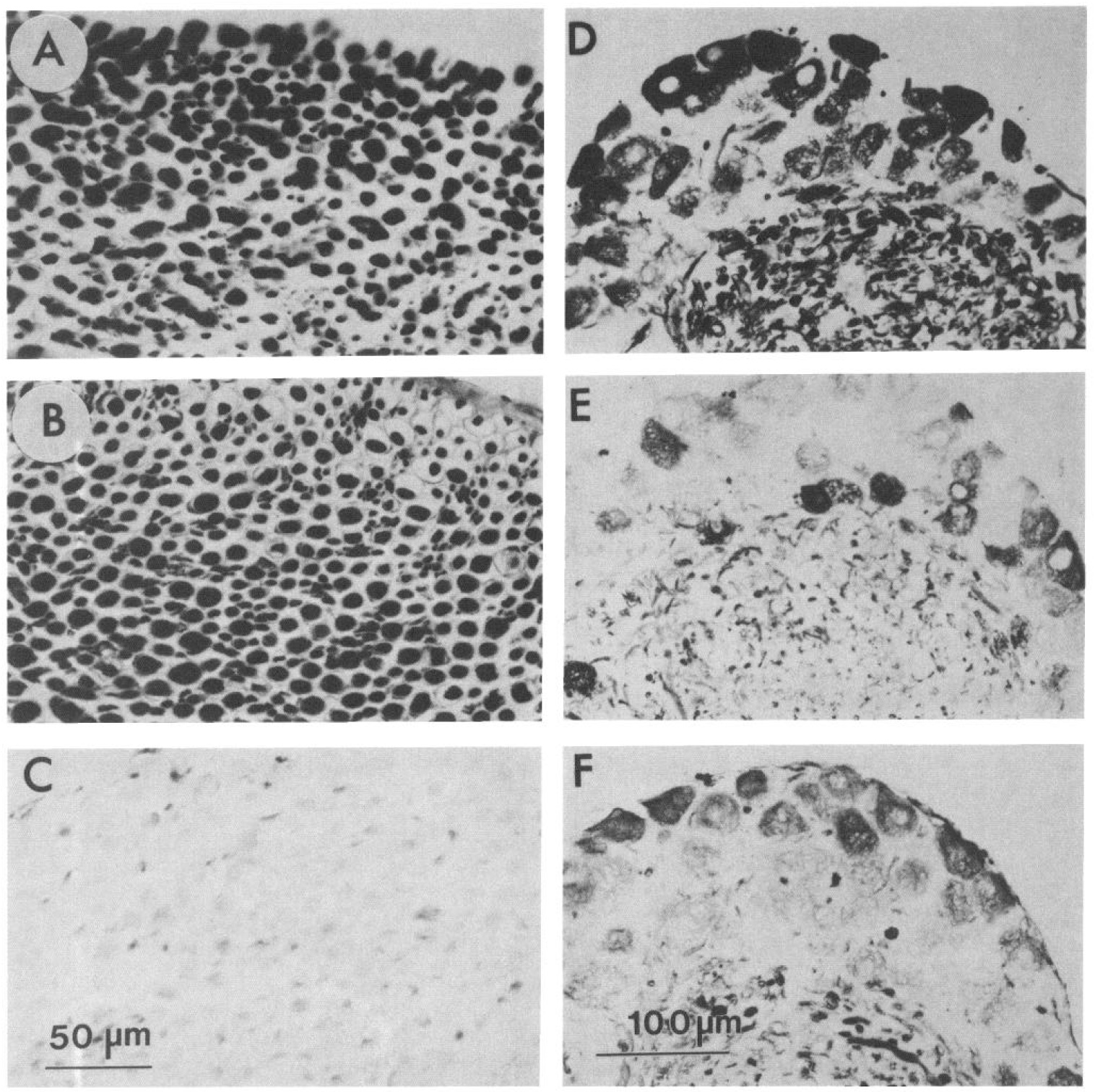 D. Cresyl violet-stained nuclei of unlabeled cells are seen in the bright-field photomicrographs. Abbreviations: e, ependymal cells; c, spinal cordcentral canal; w, white matter containing nuclei of glial cells. The 400 pm scale bar is for A-D. The 100 pm scale bar is for E and F.