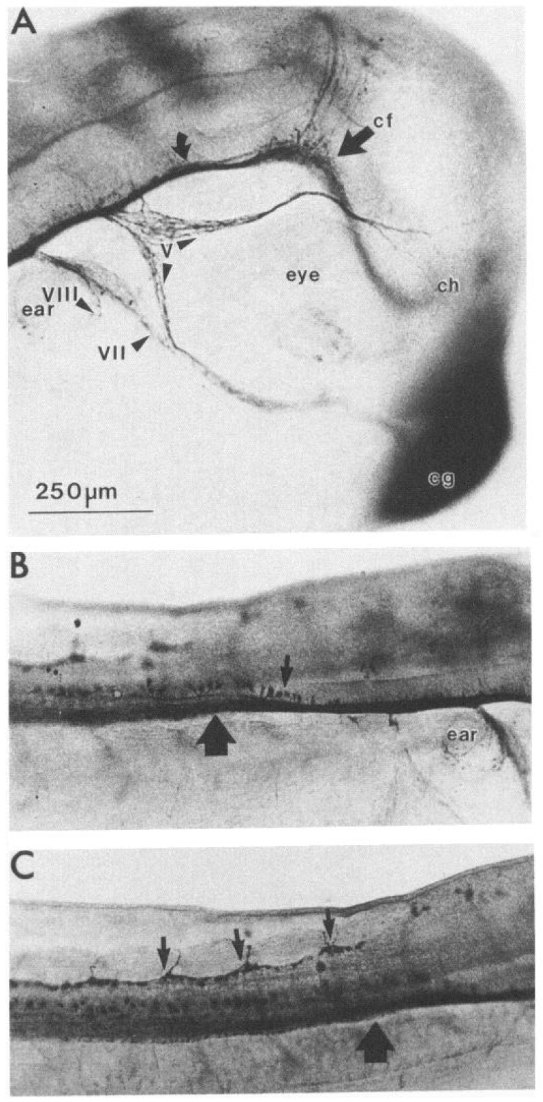 placode. B, Horizontal section through the rhombencephalon of the embryo in A; anterior is up. Arrowheads at VII, VIZZ, and IX point to anti-