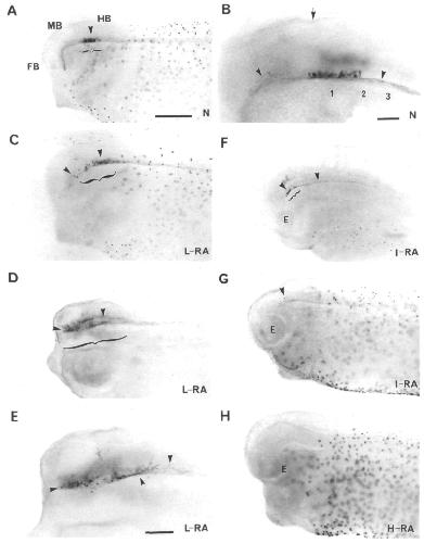 treated with high concentrations of RA show a complete absence of serotonergic cells in the CNS (H). In all cases anterior