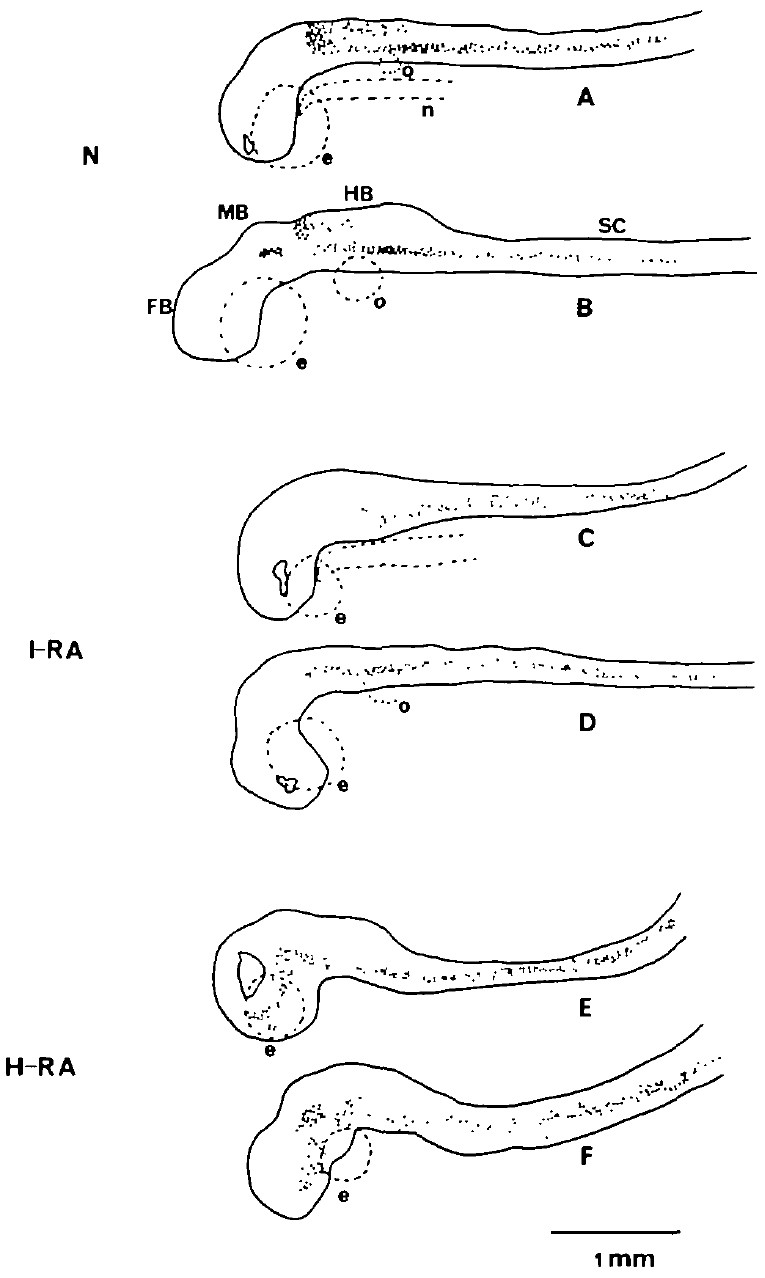 concentration of RA. Note the small anterior regions of the CNS and the reduced hindbrain (bracket). In all cases, the