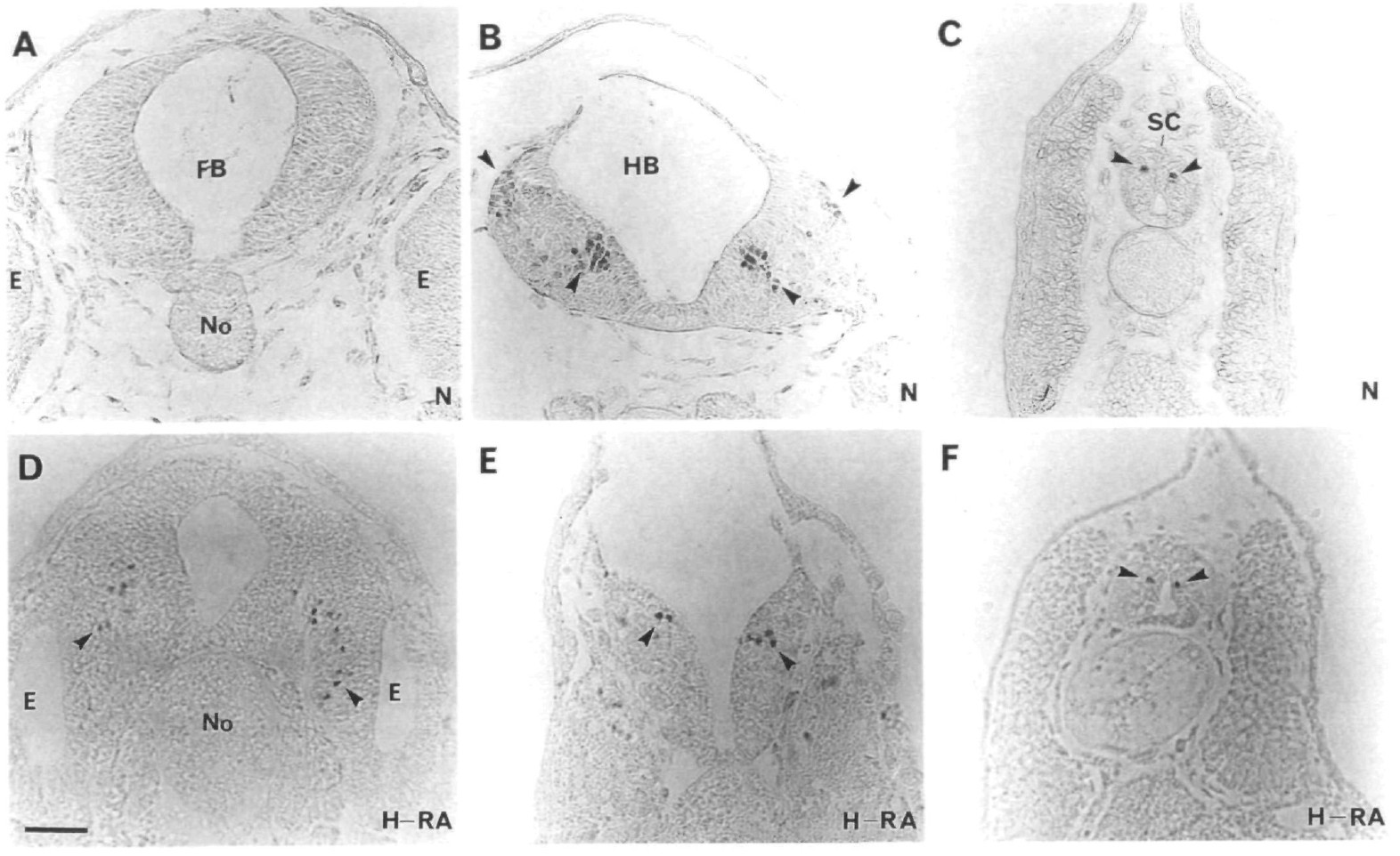forebrain; HB, hindbrain; N, normal embryo; RA, embryo treated with a high concentration of RA (H-RA); SC, spinal