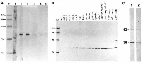 extract corresponding to one stage VI oocyte was analyzed by SDS-polyacrylamide gel electrophoresis followed by transfer onto nitrocellulose