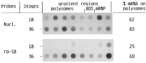 Figure 8. Polysome/mRNP distribution of nucleolin and r-protein mRNA. Cytoplasmic fractions of 15 embryos of stage 18 and 36