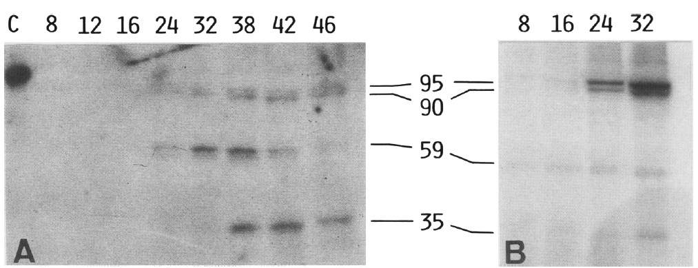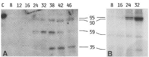 SDS-PAGE. The amount of protein per lane increases from 10 v-g for stage 8 to 100 ~g at stage 46. The gel was blotted onto