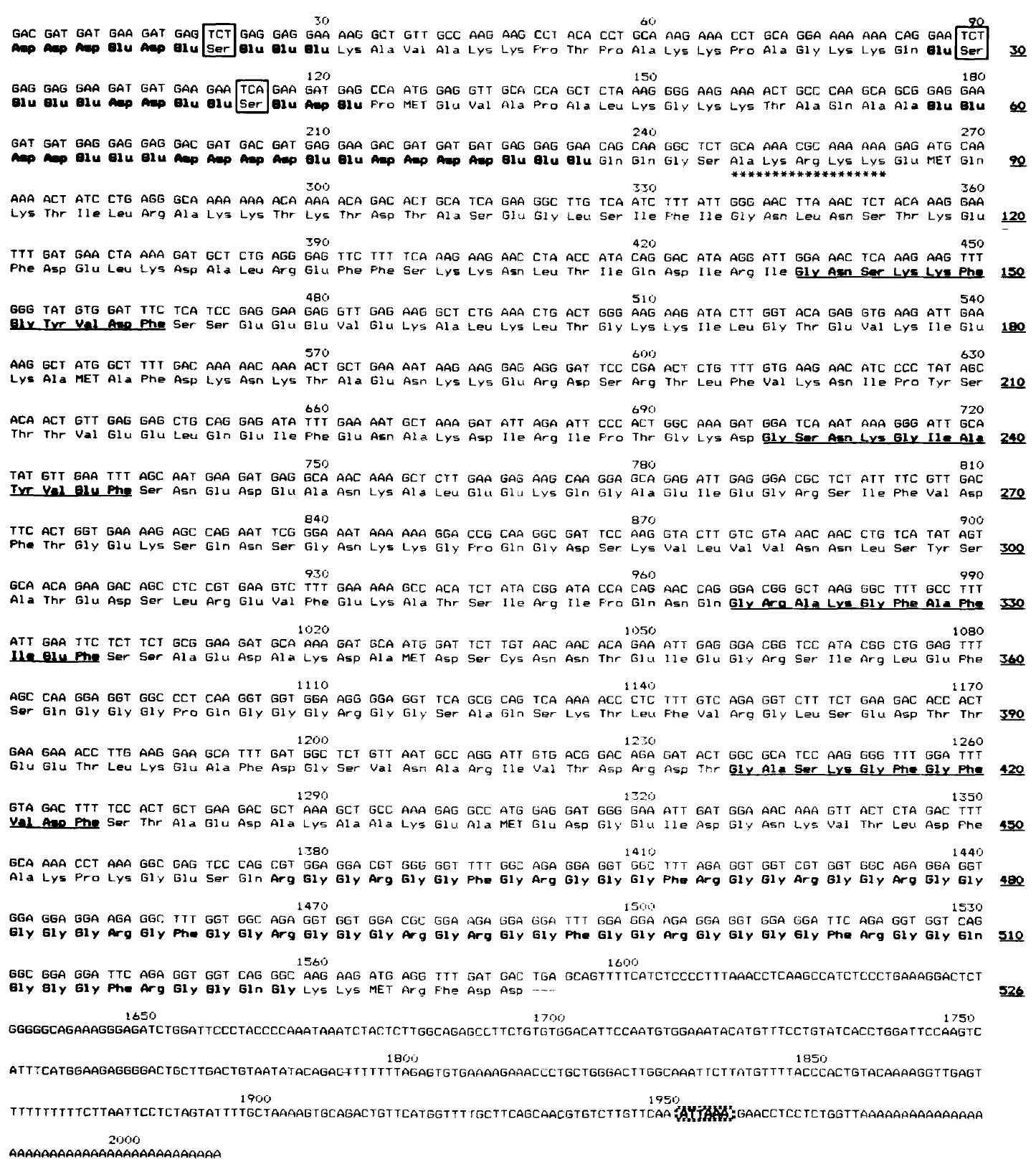 Figure 4. Xenopus nucleolin: pXomN1 DNA sequence and deduced amino acid sequence. Numbers above the DNA sequence refer