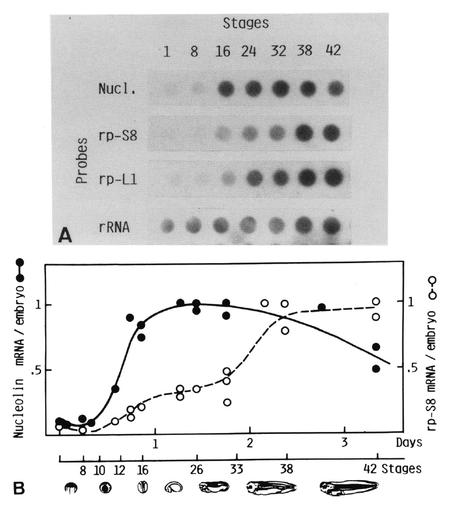 Figure 7. Relative expression of rRNA, nucleolin, and r-protein mRNAs during embryogenesis. [A) Total RNA corresponding to two