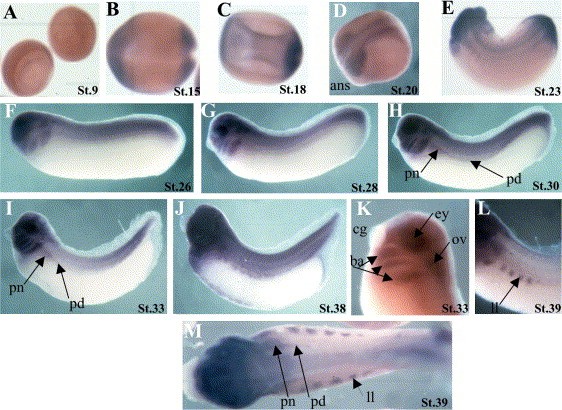 Fig. 4. Spatial expression profile of X-CypA during development. Whole-mount in situ hybridisation with an X-CypA DIG-labelled antisense RNA probe was performed on embryos from stages 9â39 as indicated in the figure. Expression was first detected in the nervous system from stage 15 (B), with apparent highest expression in the anteriorforebrain. This distribution persists throughout neurulation and early tailbud stages (CâE). At stage 26, X-CypA expression appears in the sensory organs including the eyes and otic vesicles and is maintained throughout their organogenesis (FâL). From stage 28, the gene is expressed in the pronephric kidney (H, I and M). At stage 39, expression can be clearly detected in the developing lateral line system (F). Panels AâC show embryos cleared in Murrays, panels D, KâM are uncleared embryos and panels FâJ uncleared embryos after treatment in 70% ethanol. The sense probe showed no staining pattern (data not shown). ans, anterior nervous system; pn, pronephros; pd, pronephric duct; cg, cement gland; ey, eyes; ov, otic vesicle; ba, branchial arches; ll, lateral line.