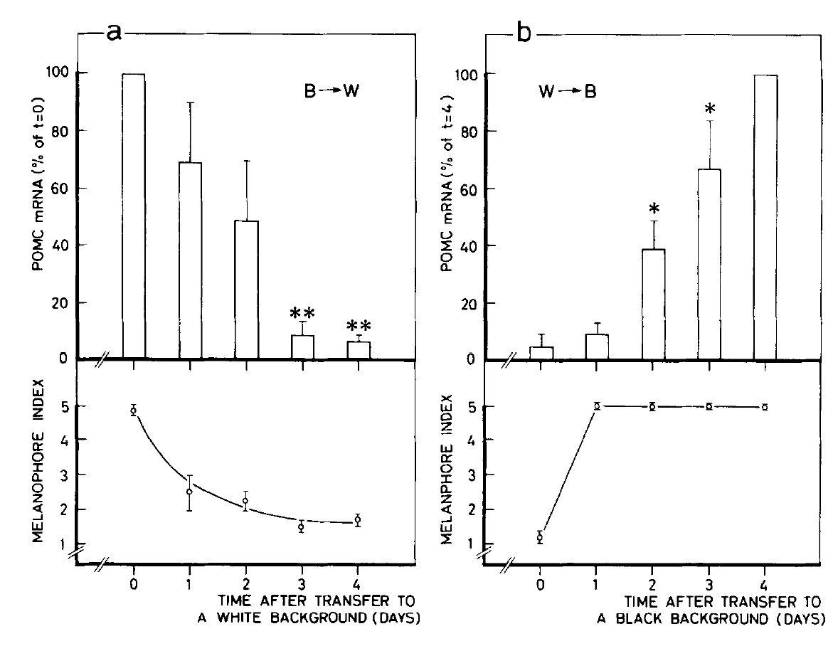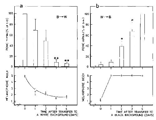 In the pars intermedia of the pituitary gland of the amphibian Xenopus laevis the level of mRNA encoding proopiomelanocortin (POMC), the precursor protein for alpha-melanophore-stimulating hormone (alpha-MSH), is shown to be dependent on physiological parameters. POMC mRNA levels in the pars intermedia of black-background-adapted Xenopus are much higher than those of white-adapted animals. These physiological changes in POMC mRNA levels are tissue-specific because they were not found in the pars distalis of the pituitary gland. Background transfer experiments revealed that modulation of POMC gene activity is much slower than changes in the secretion of alpha-MSH.