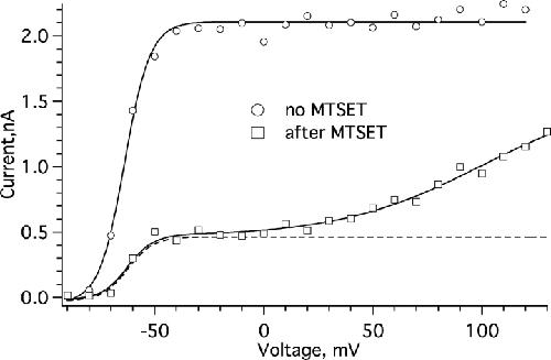 Figure 5. . Two components of activation in partially modified F370C channels. Before modification, a Boltzmann fit yields V1/2 = −63.8 ± 0.8 mV and z = 4.27 ± 0.5. After partial MTSET modification (7.7 mM·s), there is an additional, right-shifted component of activation, with z = 0.8 ± 0.2 and V1/2 estimated to be ∼+100 mV.