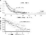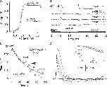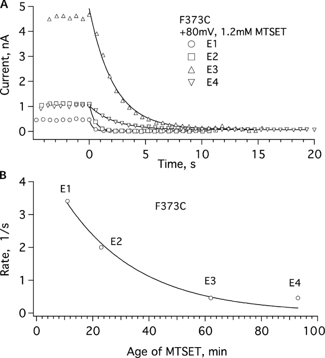 Figure 2. . Calibration of the decay of MTSET activity. Recordings of F373C currents were made from four successive inside-out patches obtained from the same oocyte. (A) Ionic current amplitude during pulses to +80 mV as a function of time of exposure to 1.2 mM MTSET solution. In the four experiments, the MTSET solution was aged 12, 21, 62, and 93 min. Single-exponential fits (solid curves) yielded decay rates of 3.41, 2.00, 0.46, and 0.46 s−1, respectively. (B). The decay rates are plotted as a function of the age of the MTSET. The time constant from this fit was 26 min. This time constant was used in Eq. 1 to correct the loss of MTSET activity due to hydrolysis.