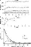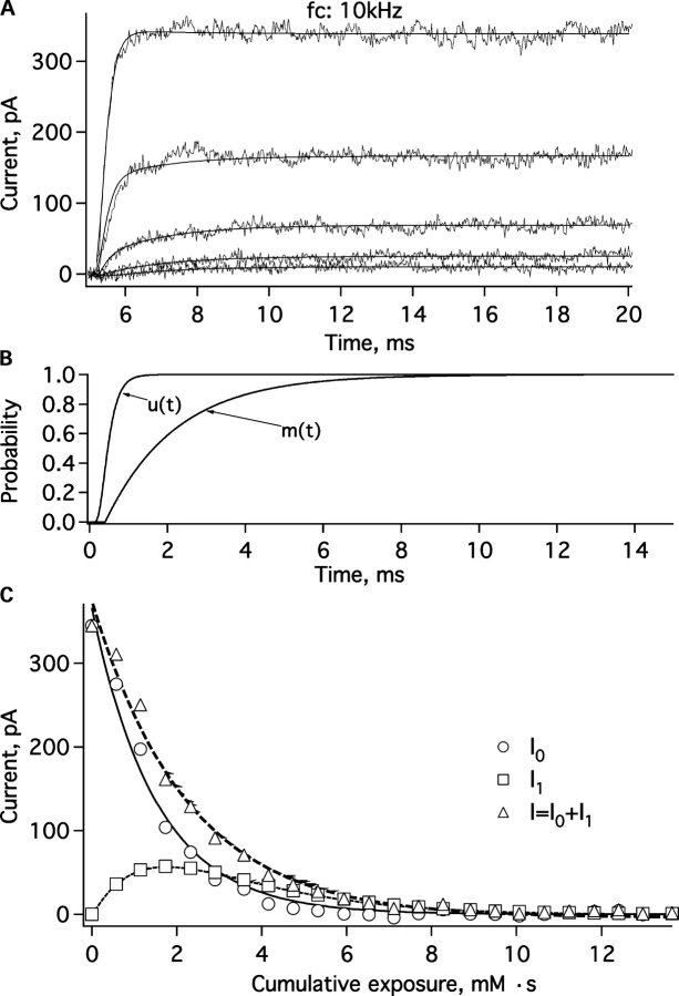 Figure 4. . Description of the MTSET modification effects at +80 mV. (A) Five representative F370C channel current sweeps recorded from the same inside-out patch as in Fig. 3 B. Fits to the activation time courses (smooth curves) were computed as sums of two exponential components. (B) The two exponential components u(t) and m(t), which are interpreted to be the normalized channel open probabilities of unmodified channels and one-subunit modified channels. (C) The amplitudes I0 and I1 of the two components, obtained from fits to sweeps at various times during the MTSET modification. The decays of the first component amplitude (circles) and the second component amplitude (squares) were fitted simultaneously to Eqs. 2, 4, and 5, yielding the subunit modification rate k = 0.165 ± 0.007 mM−1·s−1 and the amplitudes A = 366 ± 9 pA and B = 136 ± 0.4 pA. The total current amplitude (triangles) can alternatively be fitted by a single exponential with a decay rate of 0.46 ± 0.02 mM−1·s−1 (dashed curve).