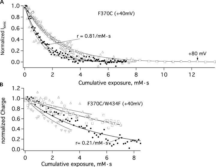 Figure 7. . Decay of ionic and gating currents with MTSET modification. (A) Time course of decay of F370C ionic currents under exposure to MTSET. Data are shown for four patches using +40 mV test pulses, along with a fifth patch (open squares, same data as in Fig. 4) using test pulses to +80 mV. The average decay rate was 0.63 ± 0.18 mM−1·s−1, while the rate estimated from the most stable recording (filled circles) yielded a rate of 0.81 ± 0.02 mM−1·s−1. (B) Decay of on gating charge under exposure to MTSET. Data are shown from four patches using test pulses to +40 mV. The average decay rate was 0.17 ± 0.1 mM−1·s−1 while the most stable recording (filled circles) had a decay rate of 0.21 mM–1·s–1.