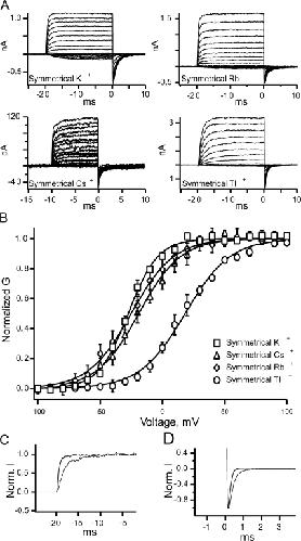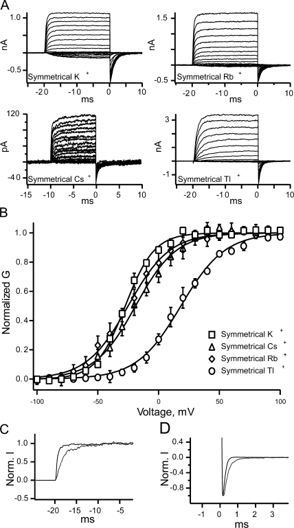 Figure 1. BK channel currents recorded with four different permeant ions. (A) Currents recorded with 100 mM symmetrical potassium, rubidium, cesium, and thallium. (B) The conductance versus voltage curve from currents recorded in symmetrical potassium (squares), symmetrical cesium (triangles), symmetrical rubidium (diamonds), and symmetrical thallium (circles). Thallium produced a significant shift in the GV curve to higher potentials as analyzed by a shift in the V1/2 of the Boltzmann fit (by ANOVA, P = 6.87 × 10−8), unlike cesium and rubidium (P = 0.845 for cesium and P = 0.954 for rubidium). Thallium, rubidium, and cesium all changed the slope of the GV curve. Thallium alters the gating of BK channels: (C) Currents in response to a 200-mV voltage step traces recorded from the same patch. Currents were normalized to the maximal steady-state current for both symmetrical potassium (black) and symmetrical thallium (gray). (D) Inward tail currents in response to a −80-mV pulse. These currents were preceded by a +200-mV pulse. Currents are normalized to the peak of the tail current. Solutions are either symmetrical potassium (black) or symmetrical thallium (gray). All currents were recorded with 300 μM internal calcium.