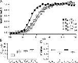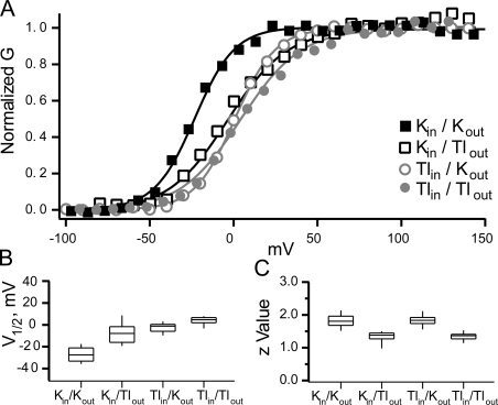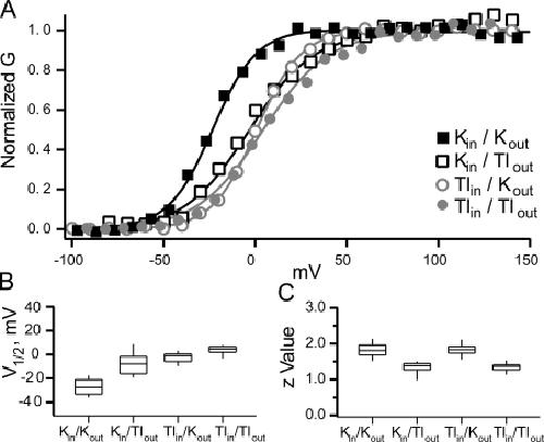 Figure 3. The gating of BK channels is influenced differently by internal and external thallium solutions. (A) The GV curve of BK channels recorded in four conditions: symmetrical potassium (solid black squares), internal potassium with external thallium (open black squares), internal thallium with external potassium (open gray circles), and symmetrical thallium (closed gray circles). The solid lines are fits with Boltzmann curve. (B) Box plots of the half activation, V1/2, from the Boltzmann fits for the four conditions. (C) Box plots of the z values from the Boltzmann fits. Box plots display the median and the 10th, 25th, 75th, and 90th percentiles. All data was recorded in 300 μM internal calcium.