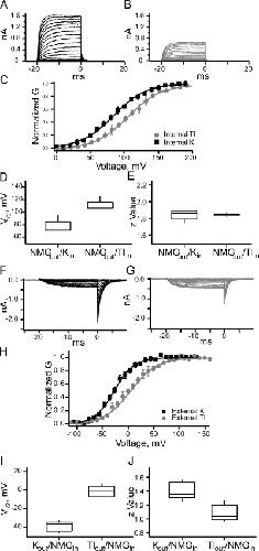 Figure 4. Gating effect from internal permeant ions. (A) Currents from an inside-out patch with external NMG and internal potassium. (B) Currents from an inside-out patch with external NMG and internal thallium. (C) The GV curves from multiple experiments. (D) Box plots of the V1/2 from Boltzmann fits of all the data with external NMG. (E) Box plots of the z values from Boltzmann fits (n = 6 for potassium and n = 5 for thallium). (F) Currents from an inside-out patch with internal NMG and external potassium. (G) Currents from an inside-out patch with internal NMG and external thallium. (H) The GV from multiple experiments. (I) Box plots of the V1/2 from Boltzmann fits of all the data with external NMG. (J) Box plots of the z values from Boltzmann fits. (n = 11 for potassium and n = 13 for thallium).