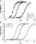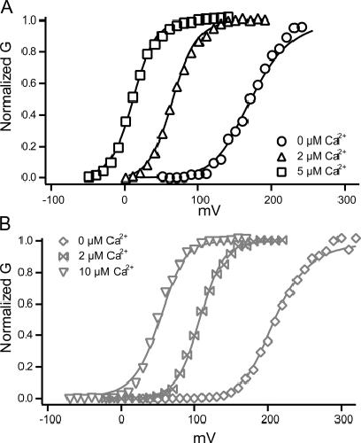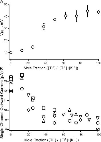 Figure 5. The shift in the GV curve as internal potassium is replaced by thallium. (A) V1/2 from Boltzmann curve fits plotted as a function of the concentration of internal thallium. (B) The single channel current at 70 mV as a function of the concentration of internal thallium. The different symbols represent data recorded from different patches. All patches were recorded in external potassium and 50 μM internal calcium. The osmolarity is balanced by potassium.