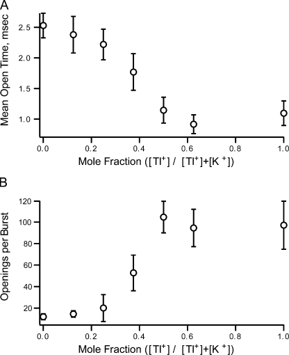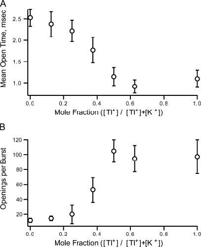 Figure 10. Mole fraction effects on the mean open time and number of openings per burst. At point 0 on the x axis, the internal solutions is 100 mM potassium. The potassium in the internal solution was replaced by thallium until the internal thallium concentration was 100 mM. Potassium solutions were external for all experiments and the membrane potential was held at 70 mV. (A) The mean open time decreased as thallium replaced potassium. (B) The number of openings per burst increased as the fraction of thallium increased.