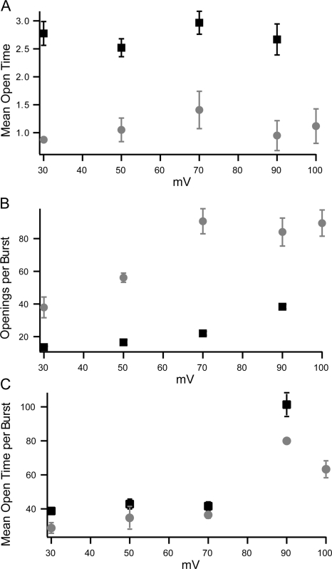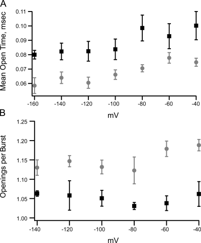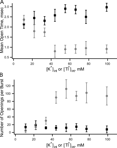 Figure 12. (A) Mean open time (overestimate) from patches containing multiple channels. Symbols are the average ± SEM of mean open durations from patches with symmetrical potassium (black squares, n = 10) or internal potassium and external thallium (gray circles, n = 9). (B) Average number of openings per burst recorded at very low PO for currents recorded with potassium (black squares, n = 10) and symmetrical thallium (gray circles, n = 11).