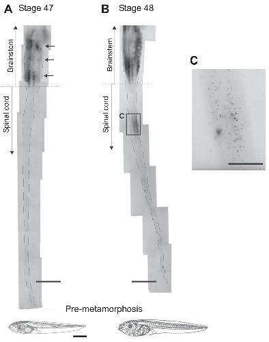 emergence and by stage 51 two longitudinal clusters are clearly evident. Through later pre-metamorphic stages, staining is restricted to the two spinal clusters, but