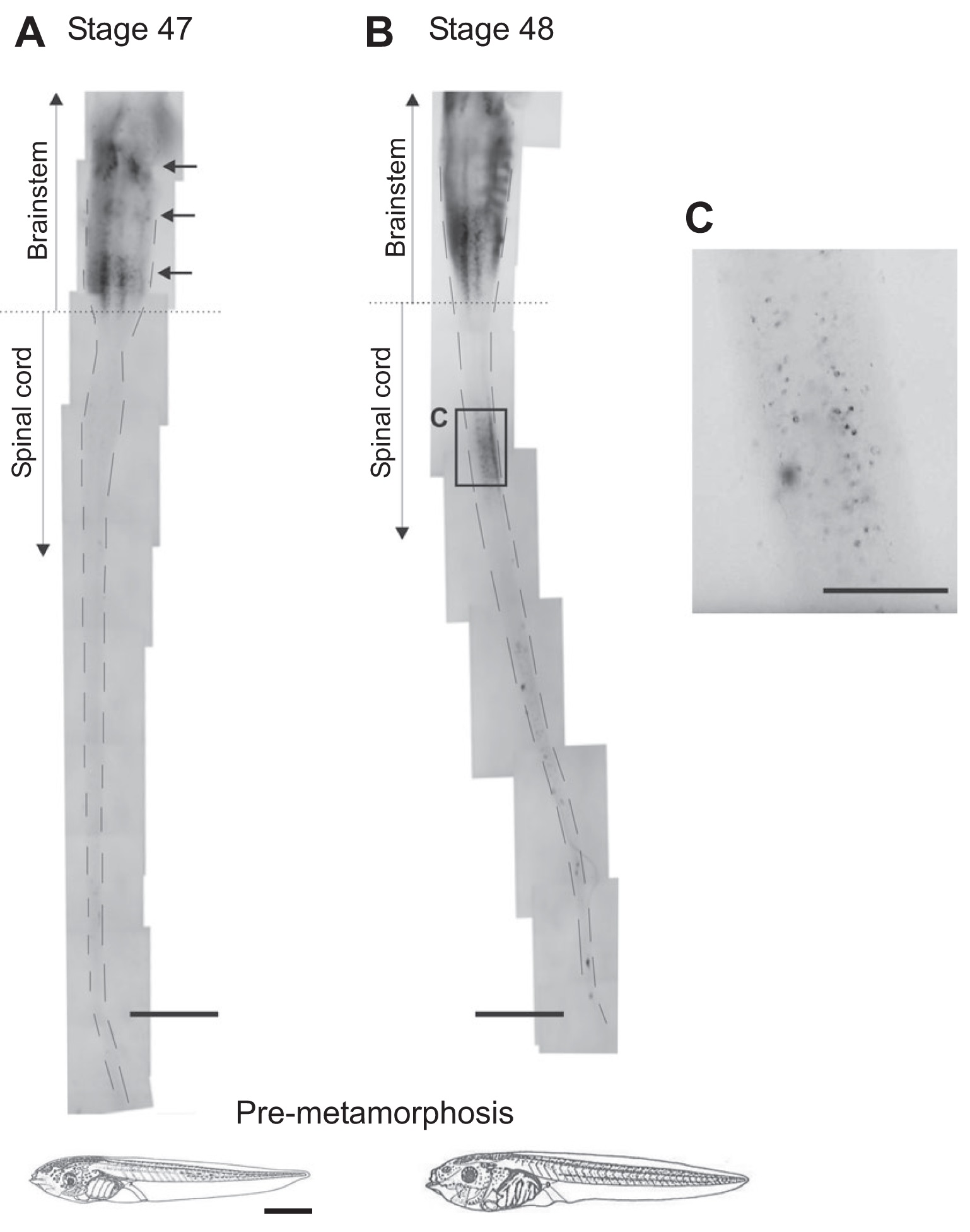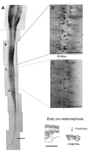 increases as metamorphosis progresses. By pro-metamorphic stage 57, intense neuronal staining is seen throughout the length of the spinal cord, and this persists