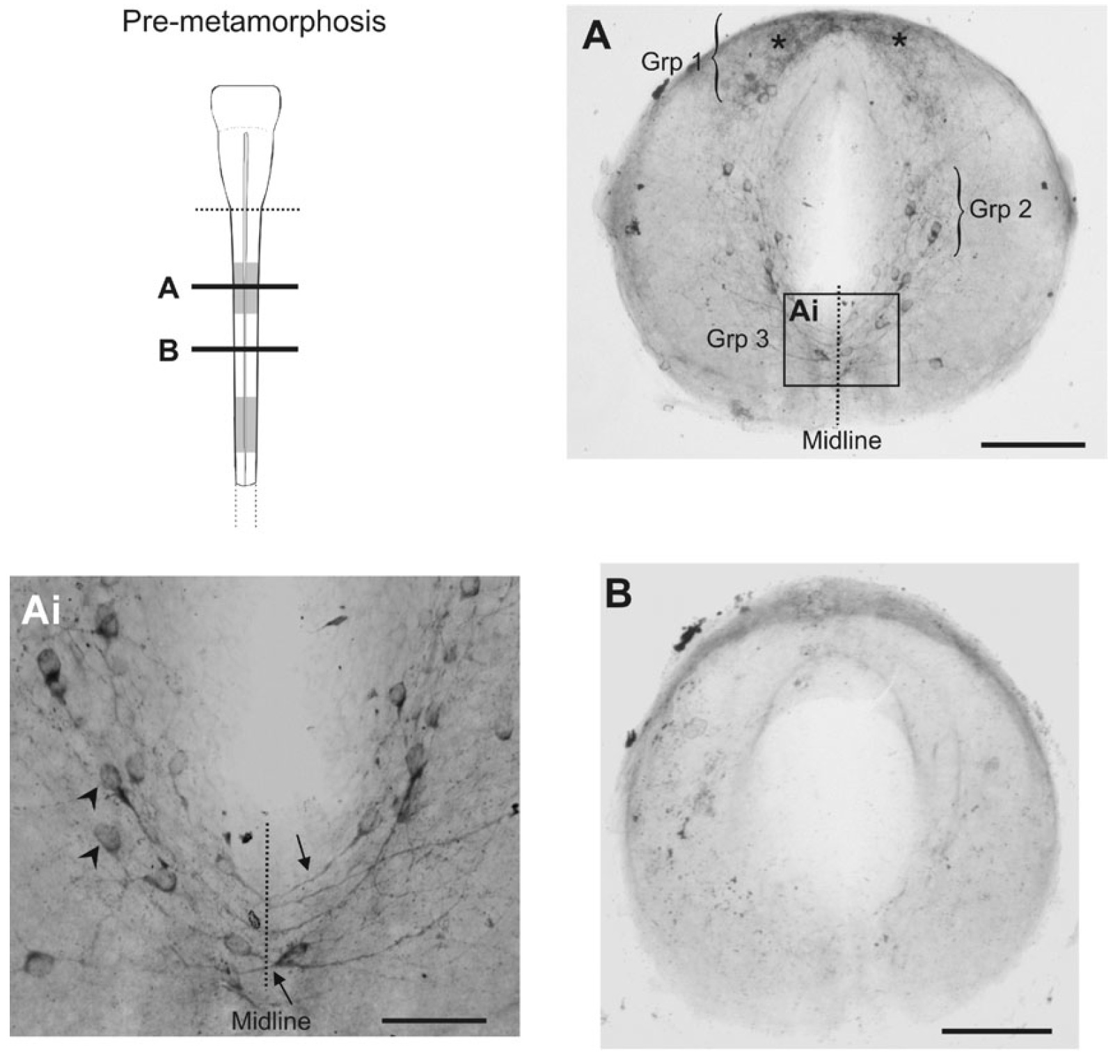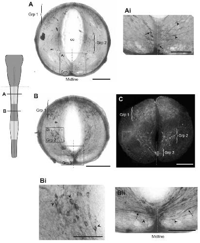group (Grp 2) of multipolar neurons with axonal processes that project both dorsally and ventrally; a third ventral group (Grp 3; magnified in Aii) consisting of