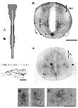 spindle-shaped neurons (arrowhead) that send axonal processes bilaterally, many of which cross the midline. (B) In the lumbar region, labelling continues to occur