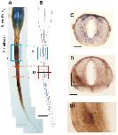 Fig. 6. NADPH-d reactivity in wholemount spinal cord of a late pro-metamorphic stage 57tadpole. Schematic of wholemount CNS at left indicates the positions