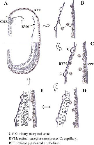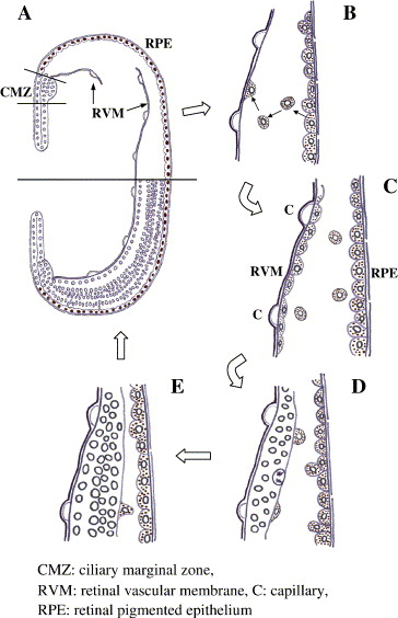 Fig. 10. Schematic diagram of retinal regeneration in X. laevis. The upper part in (A) shows retinectomized eye cavity, and the lower shows intact one. Cells from two origins regenerate the retina; ciliary marginal cells and the retinal pigmented epithelial cells. The CMZ (ciliary marginal zone) partially remains after retinectomy with the present surgical procedure, and CMZ stem cells initiate migration on the RVM (retinal vascular membrane) to the posterior direction. (B) At the same time, some of RPE cells leave RPE layer, migrate and attach to the RVM, where they form a new RPE layer as indicated in (C). Numerous capillaries (indicated as C) are seen in RVM. RPE cells on the RVM proliferate and transdifferentiate to neural retinal precursor cells (D, E). RPE cells that were positively stained for RPE65 are shown by brown-colored nuclei or pigmented granules in the cytoplasm.