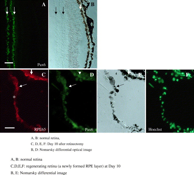 Fig. 5. RPE65 and Pax6 immunocytochemistry in the regenerating retina at Day 10 after retinectomy. (A, B) Pax6 staining and Nomarsky differential image of normal Xenopus retina. Arrows indicate two layers of positively stained ganglion and amacrine cells. (C, D, E, F) A newly formed pigmented layer (asterisk) and the original RPE layer (arrowhead) at Day 10 after retinectomy. Pigmented cells in both layers are mostly doubly stained for RPE65 and Pax6, as shown by arrows. Scale bars in A and C are 50 μm and 20 μm, respectively.