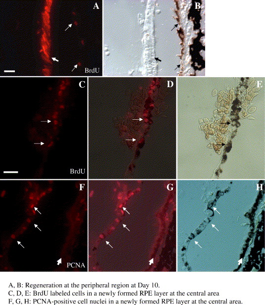 Fig. 6. Detection of proliferating cells by BrdU labeling and PCNA staining at Day 10 after retinectomy. (A, B) At the peripheral area close to the iris, numerous cells in a thick epithelial layer (arrowhead), probably derived from the ciliary marginal cells, are intensely stained for BrdU. A few cell nuclei in the RPE layer are also stained (arrows). B shows Nomarsky differential image of A. (C, D, E) At the central area, pigmented cells in a newly formed epithelium are stained for BrdU (arrows in C, D and E). D is an overlaid image of C and E. (F, G, H) Cells in the pigmented layer of the central area are also stained for PCNA. Nuclei of pigmented cells are positively reacted for PCNA (arrows). Arrowheads indicate RPE layer. G is an overlaid image of F and H. Scale bar in A is 20 μm. Bar in C is 20 μm and applied to F.